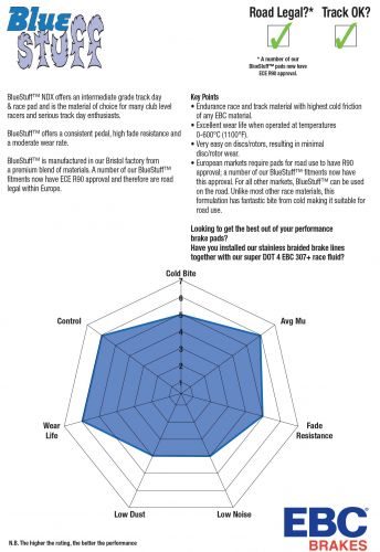 Las pastillas de freno delanteras EBC Bluestuff son un material deportivo y de competición de alta fricción.
