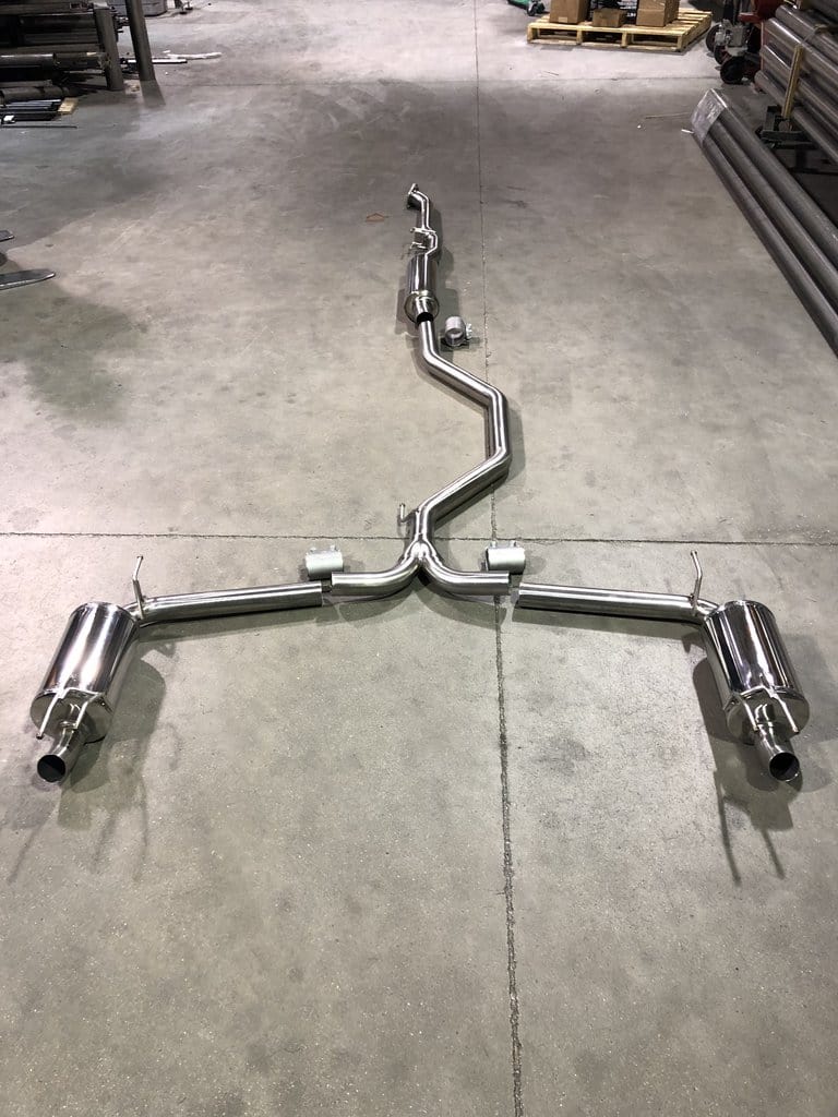 Este es un sistema de escape trasero con tubo frontal doble de 2,5”/2,25” que mantiene todos los soportes originales y es una instalación de ajuste directo.