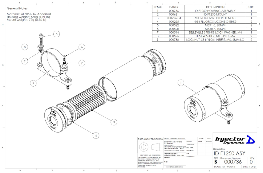 El F1250 tiene componentes internos totalmente anodizados, juntas tóricas de fluorosilicona y un elemento de filtro de fibra de vidrio que lo hace compatible con todos los combustibles.