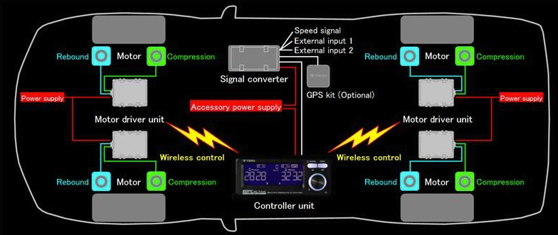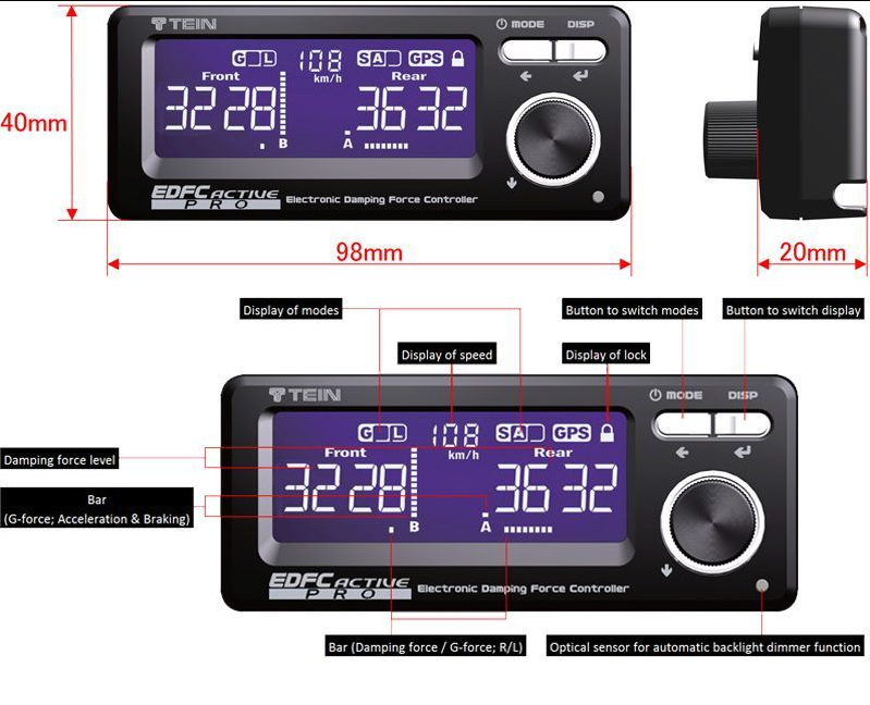 Las nuevas funciones, como el ajuste individual de 4 amortiguadores, el ajuste automático lateral (en curvas) accionado por G, la entrada de pulsos de velocidad del vehículo y dos puertos de entrada adicionales para comunicarse con el conductor, permiten aprovechar al máximo el potencial de cada amortiguador, así como del propio vehículo. Disfrute de una nueva dimensión del rendimiento de los amortiguadores que ofrece EDFC ACTIVE PRO. (Patente en trámite) EDFC ACTIVE PRO es una versión de alta gama de EDFC ACTIVE que permite el ajuste automático de la fuerza de amortiguación según los cambios en la fuerza G longitudinal y la velocidad del vehículo, e incluye funciones nuevas y mejoradas.