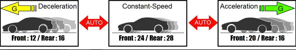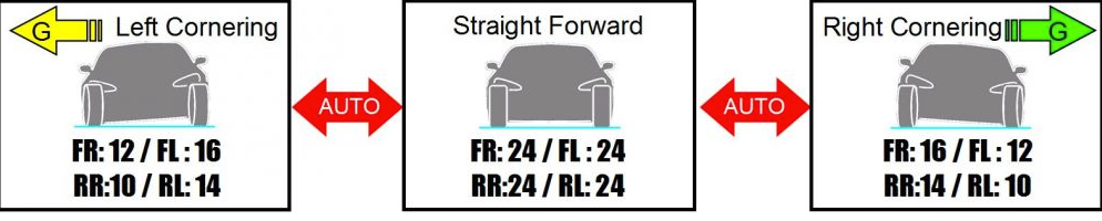 Modo de ajuste automático accionado por G lateral Este modo permite el ajuste automático según los cambios en la fuerza G lateral (en curvas). Hay 2 modos independientes disponibles: "G-Arrange Mode" para ajustar la fuerza de amortiguación cuando la fuerza G alcanza el valor preestablecido (máximo 10 memorias) cada vez, y "G-Linear Mode" para ajustar linealmente según los valores de fuerza G preestablecidos, complementando automáticamente los valores intermedios.